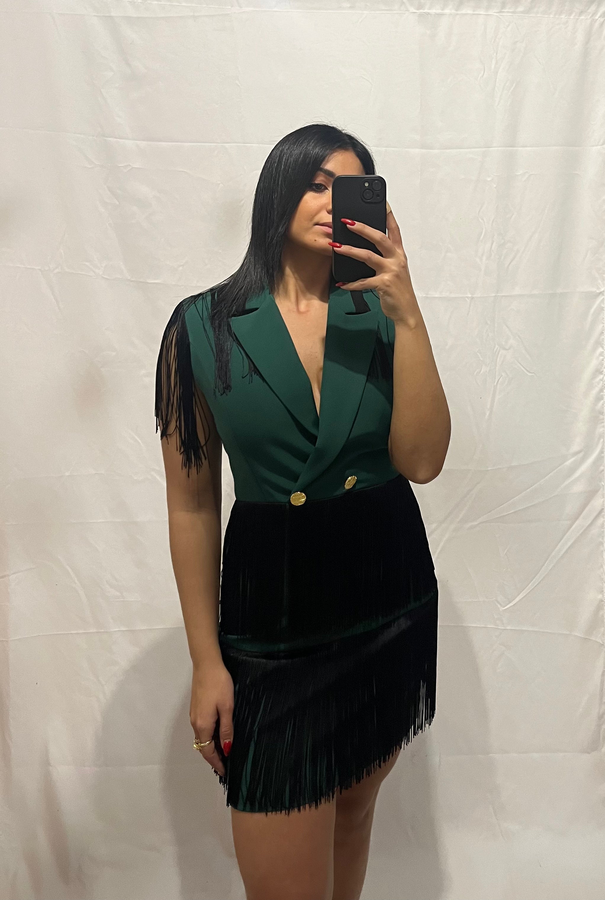 L'Abito Alice verde, giacca con frange, è un mix perfetto di eleganza e originalità.
