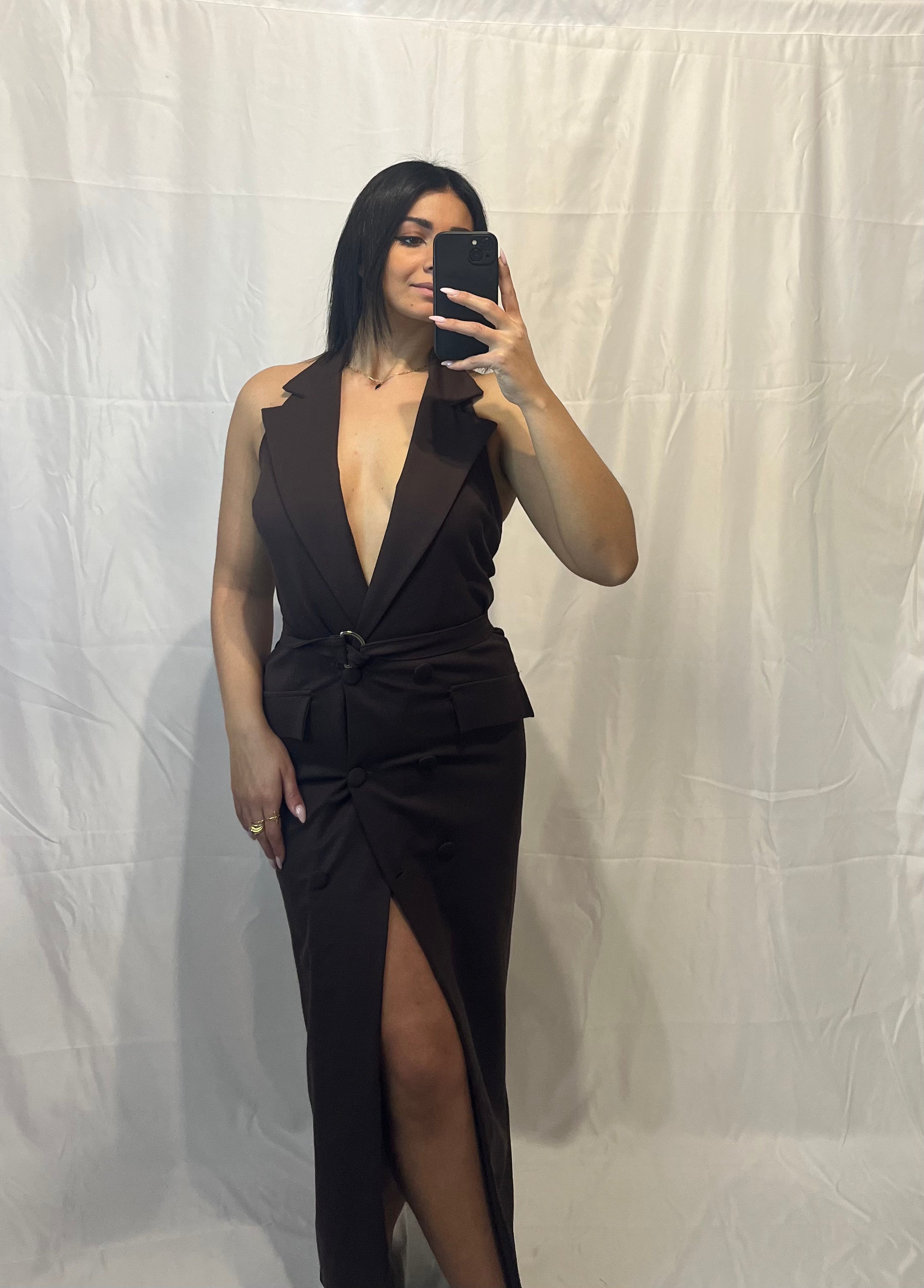 L'Abito Aura marrone, lungo con scollo gilet, combina comfort e stile.