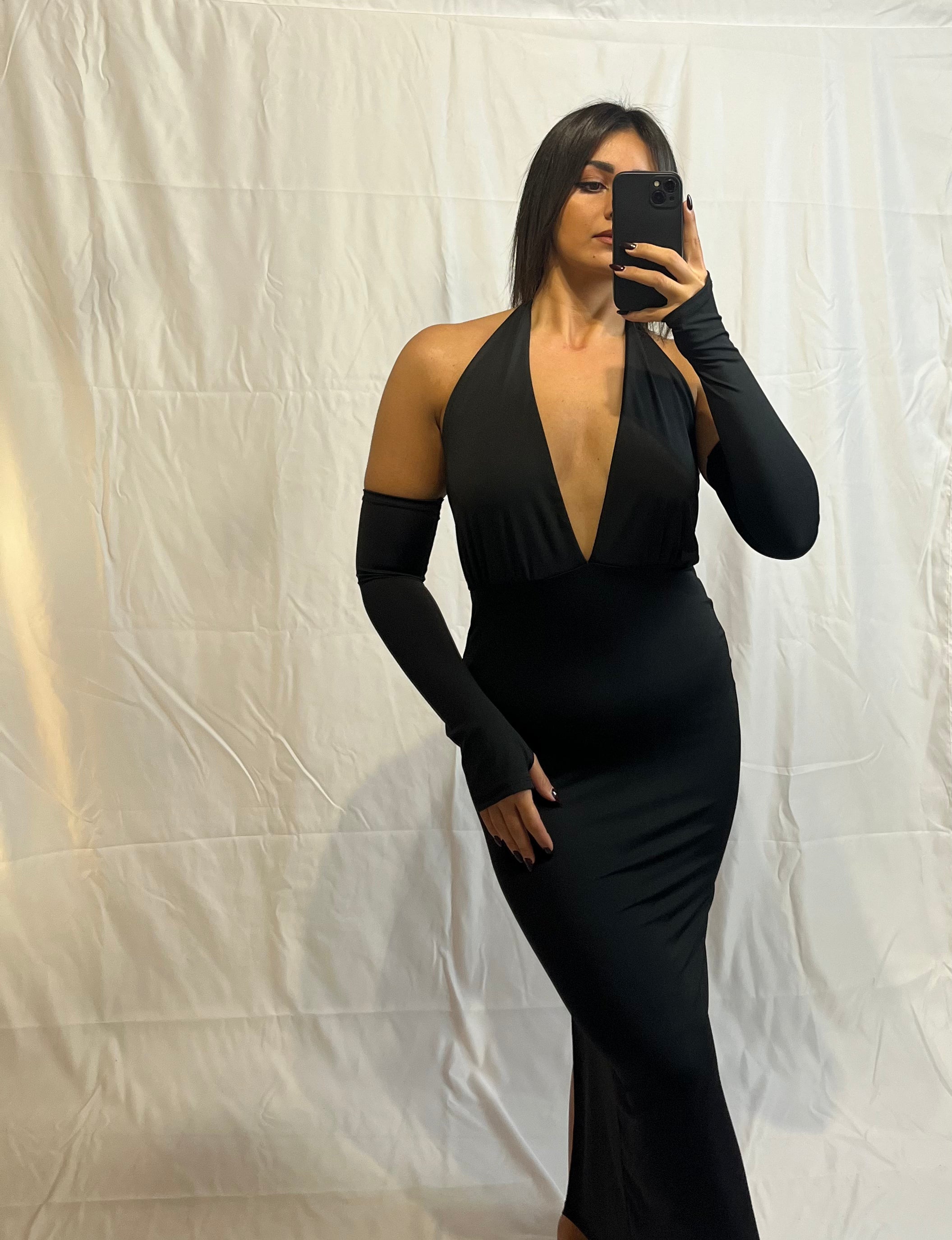 L'Abito Clara nero, lungo e in tessuto elasticizzato, è versatile e chic.