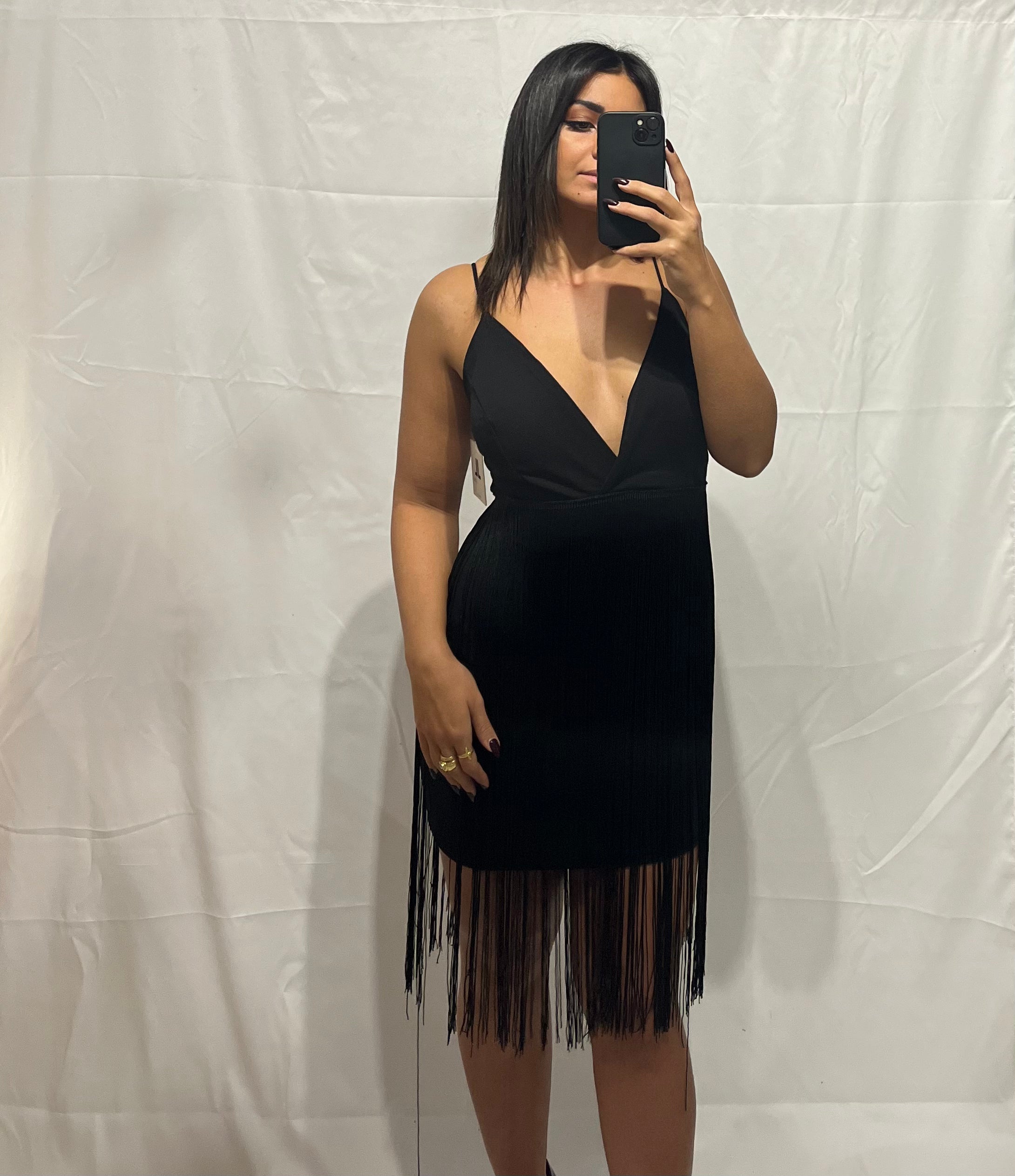 L'Abito Frangia nero, corto e in poliestere, è sinonimo di stile unico.