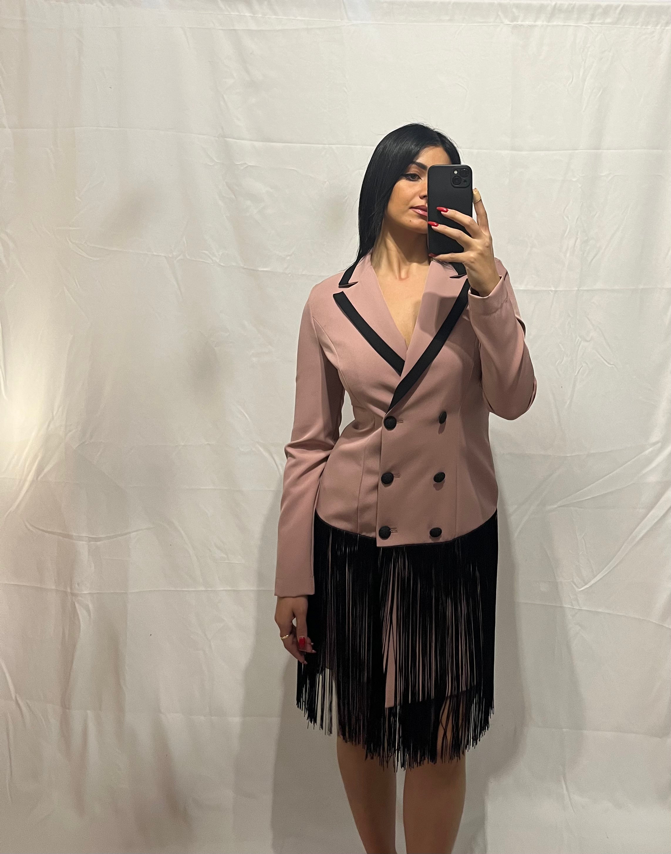 L'Abito Giacca nero doppio petto con frange è l’epitome di stile e dinamismo.