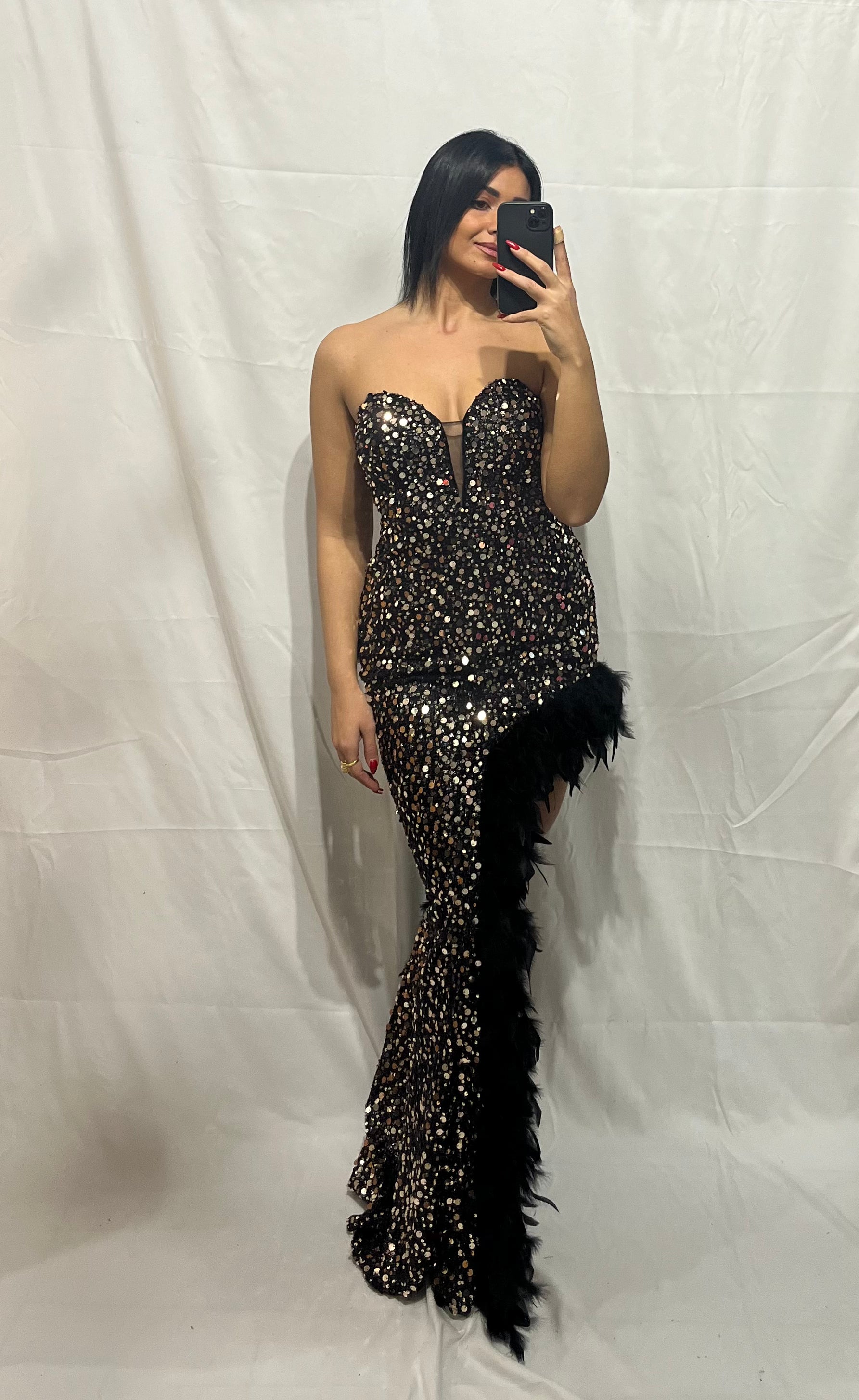 L'Abito Lucia nero e oro in paillettes, con spacco profondo e piume, è il massimo della raffinatezza.