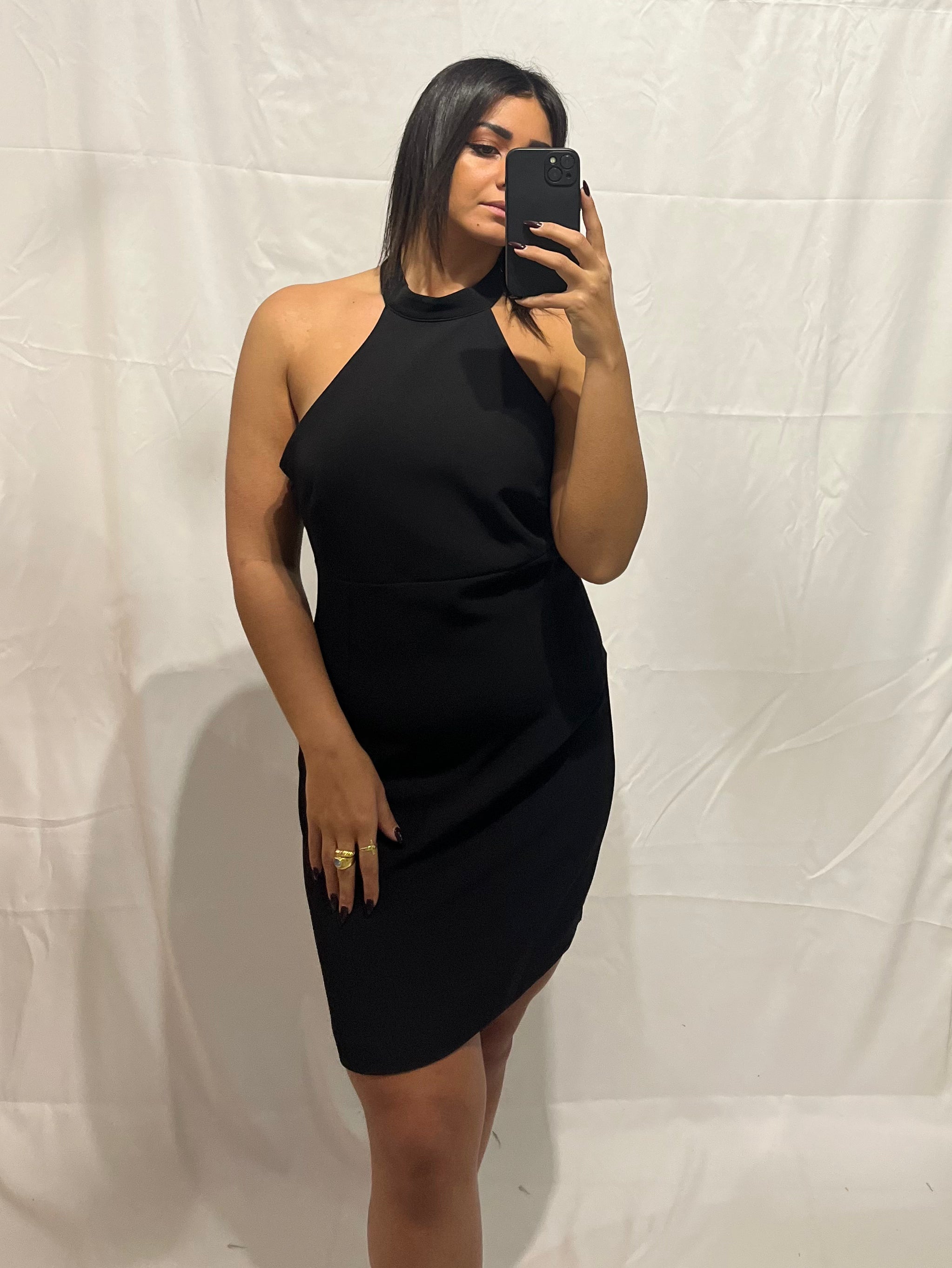 L'Abito Lumina nero, corto e in poliestere, combina comfort e stile.