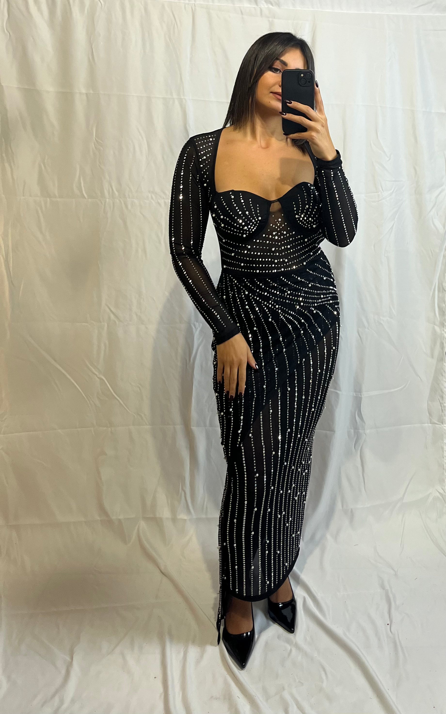 L'Abito Margaret nero, velato e lungo, è un simbolo di eleganza.
