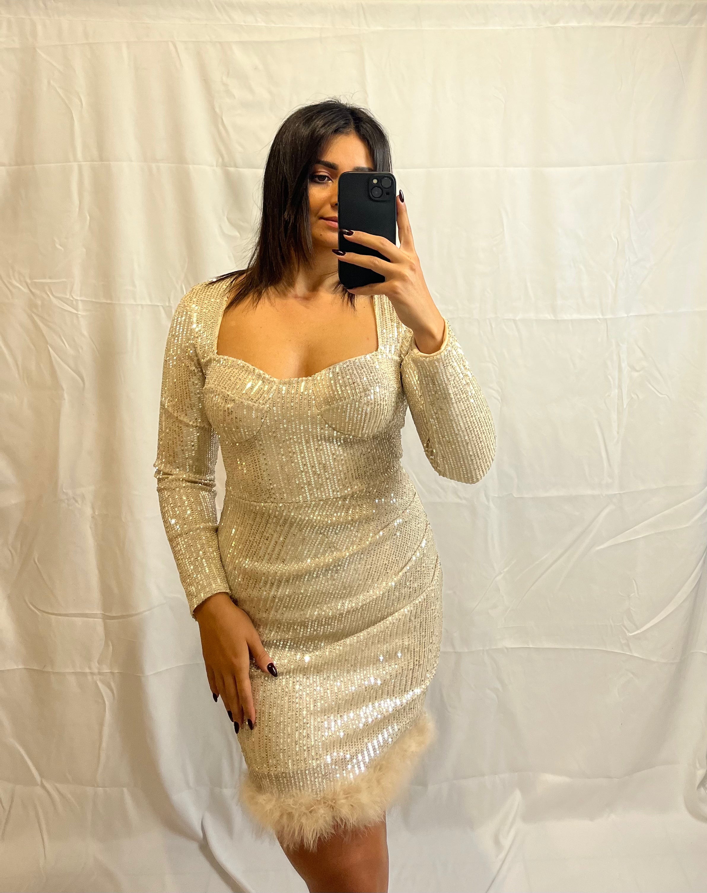 L'Abito Nunzia combina paillettes scintillanti e piume delicate.