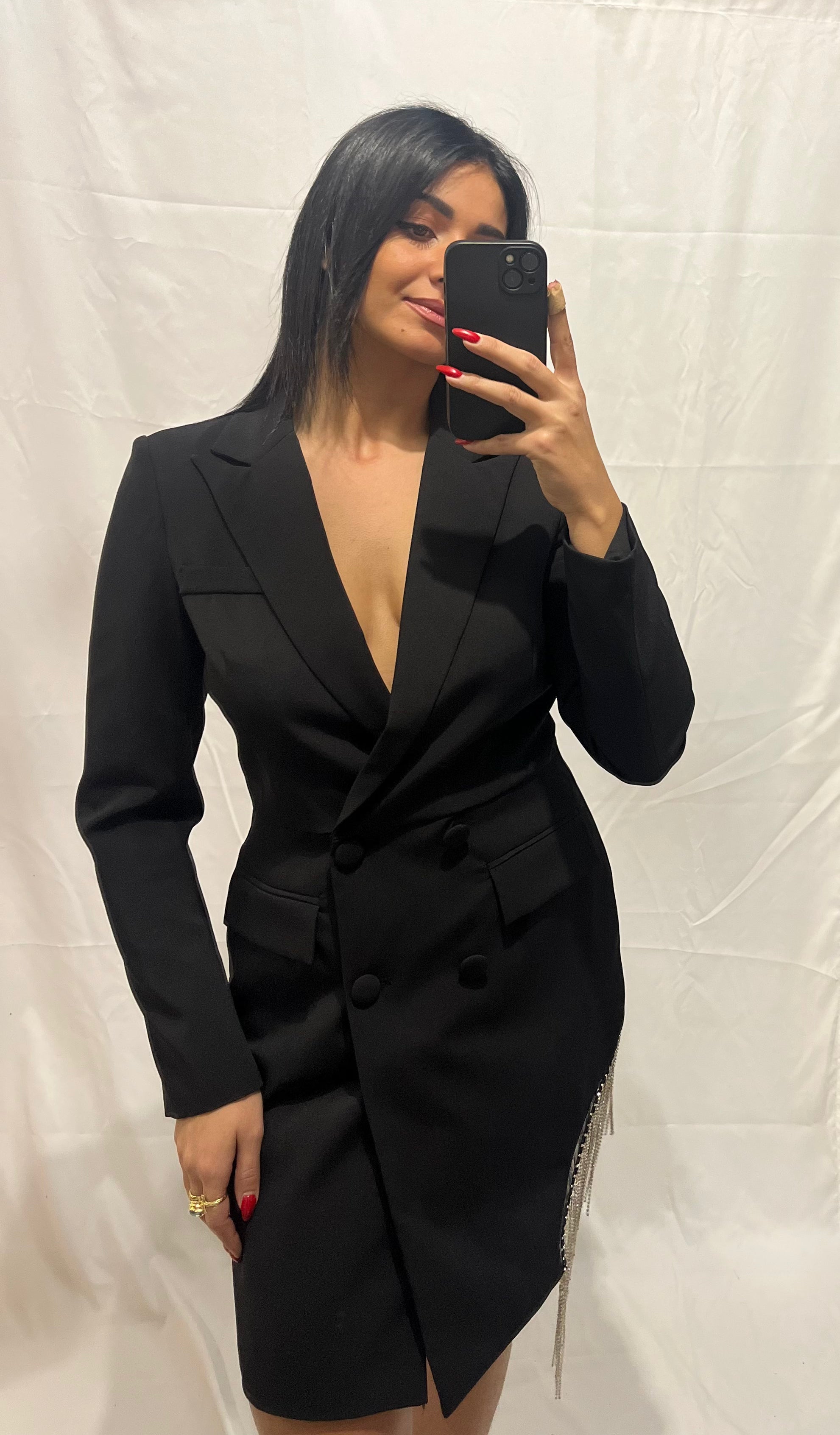 L'Abito Strass nero con doppio petto e dettagli in strass è perfetto per chi ama brillare.