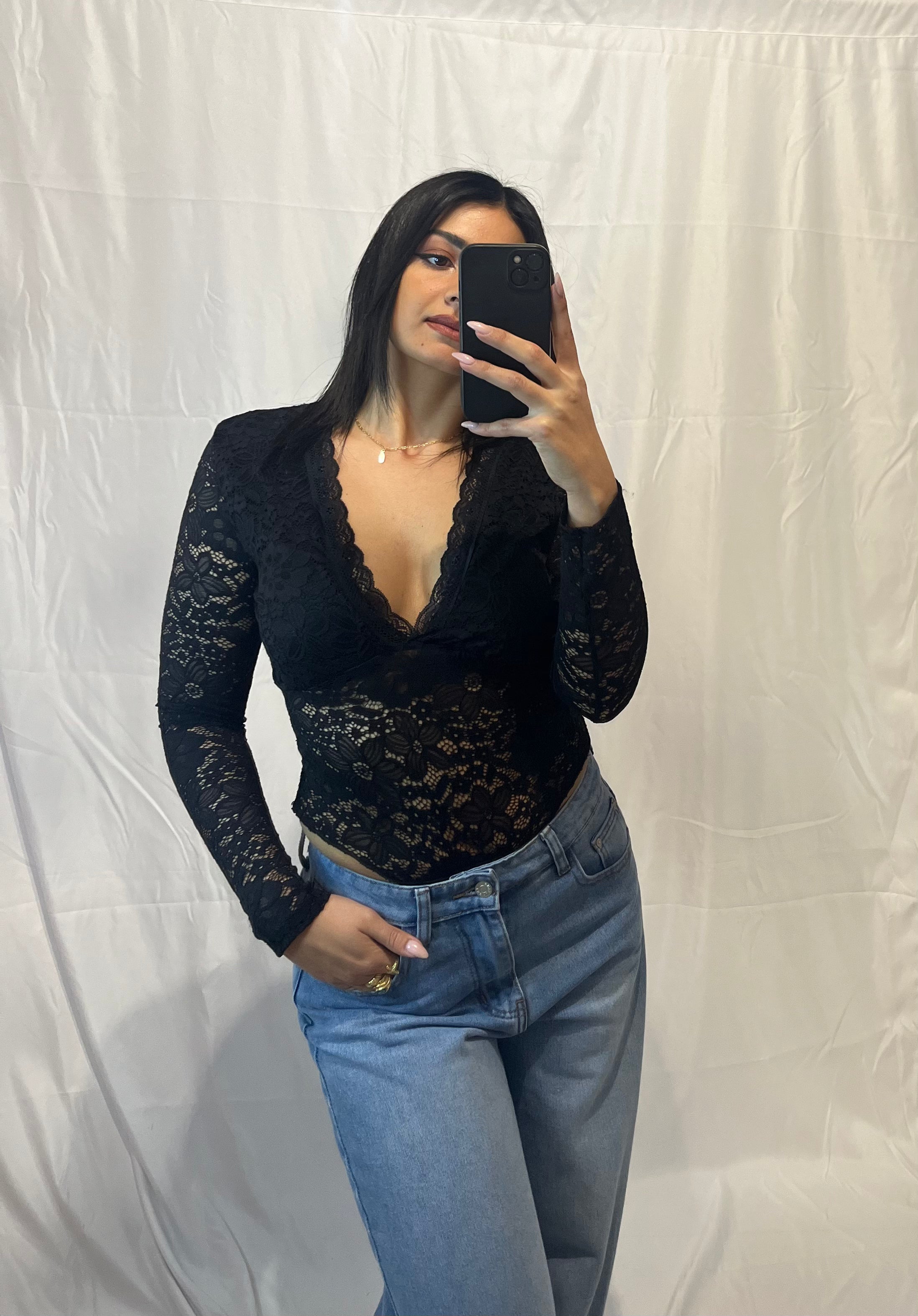 Il Body in pizzo a manica lunga, disponibile in rosa e nero, è pura eleganza.