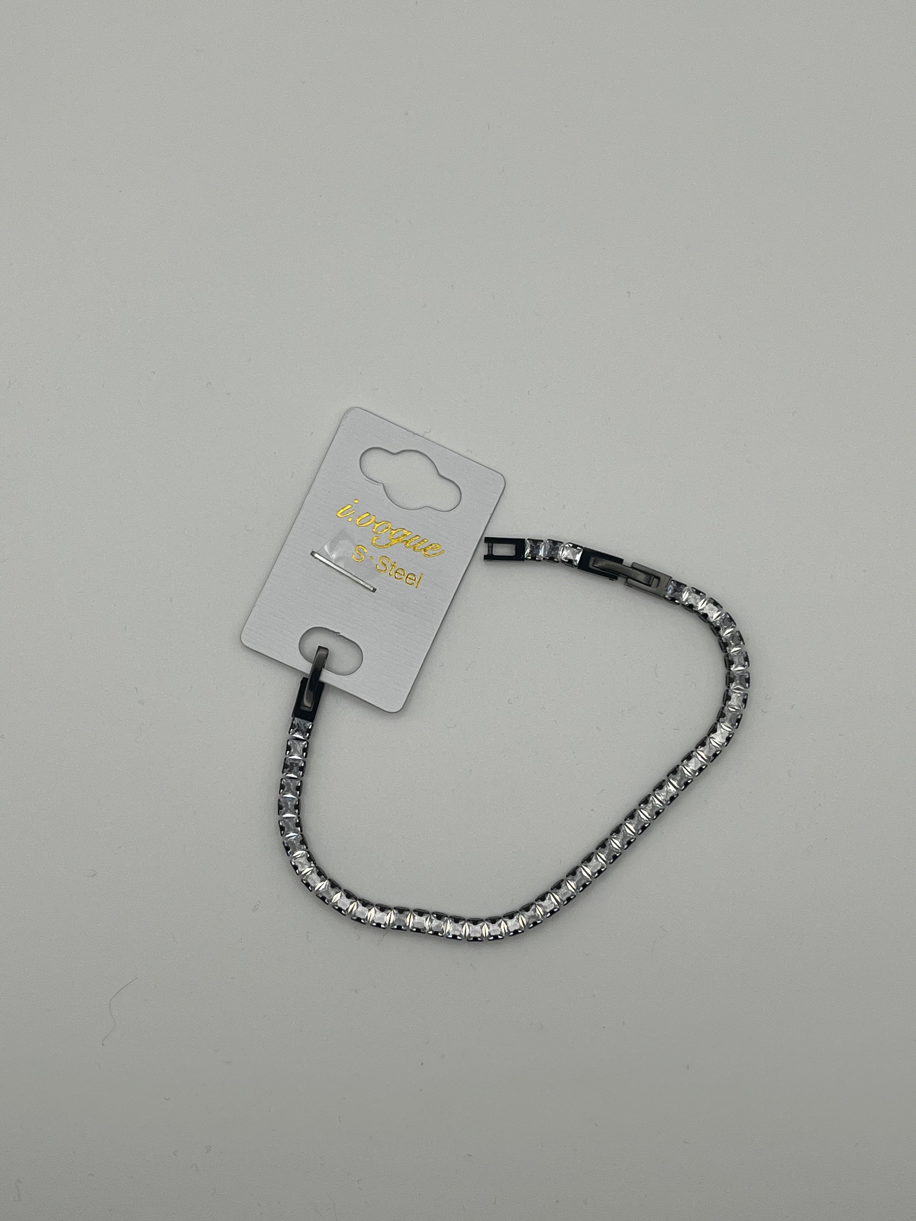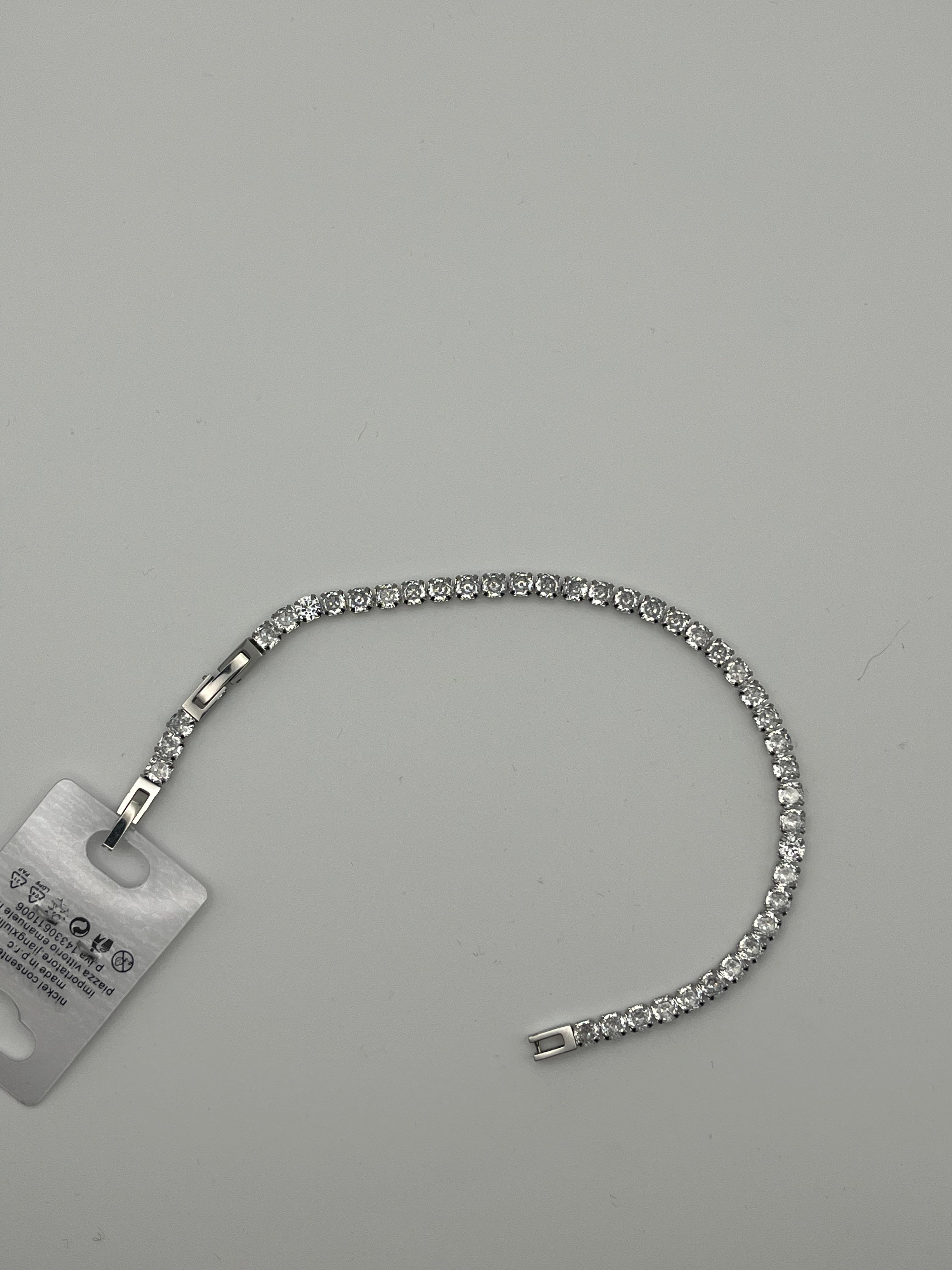 Bracciale tennis bianco in acciaio, con nichel nei limiti consentiti. Un classico intramontabile, impreziosito da cristalli bianchi che riflettono la luce con discrezione e raffinatezza.
