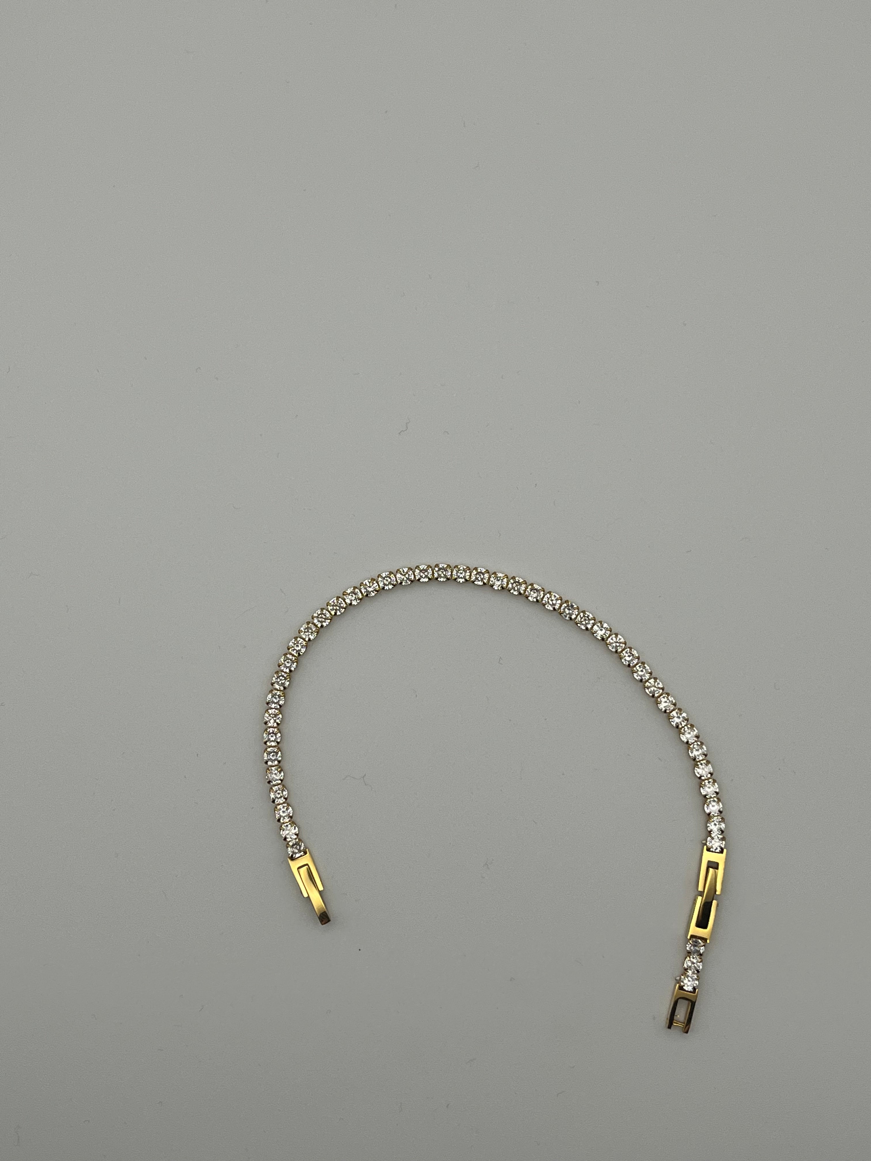Bracciale tennis bianco e dorato in acciaio, con nichel nei limiti consentiti. Un’elegante combinazione di cristalli bianchi e finitura dorata, per un gioiello che unisce classe e modernità.