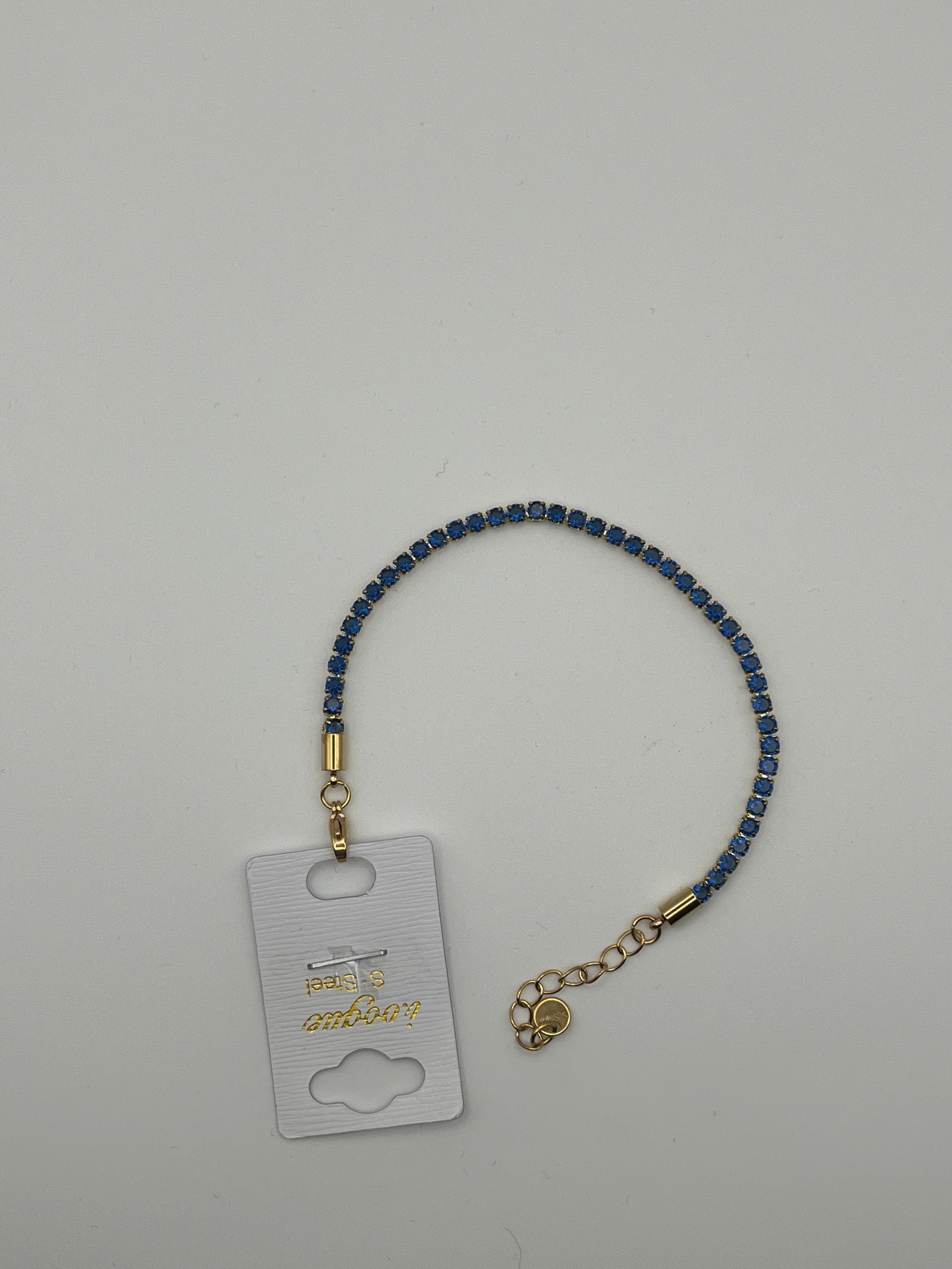 Bracciale tennis con cristalli blu e catena bicolor in finitura argento e dorata, realizzato in acciaio con nichel nei limiti consentiti. Un gioiello dal design originale, pensato per chi ama distinguersi con eleganza.