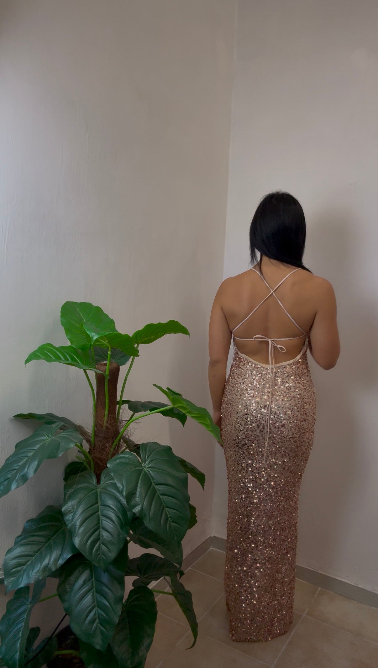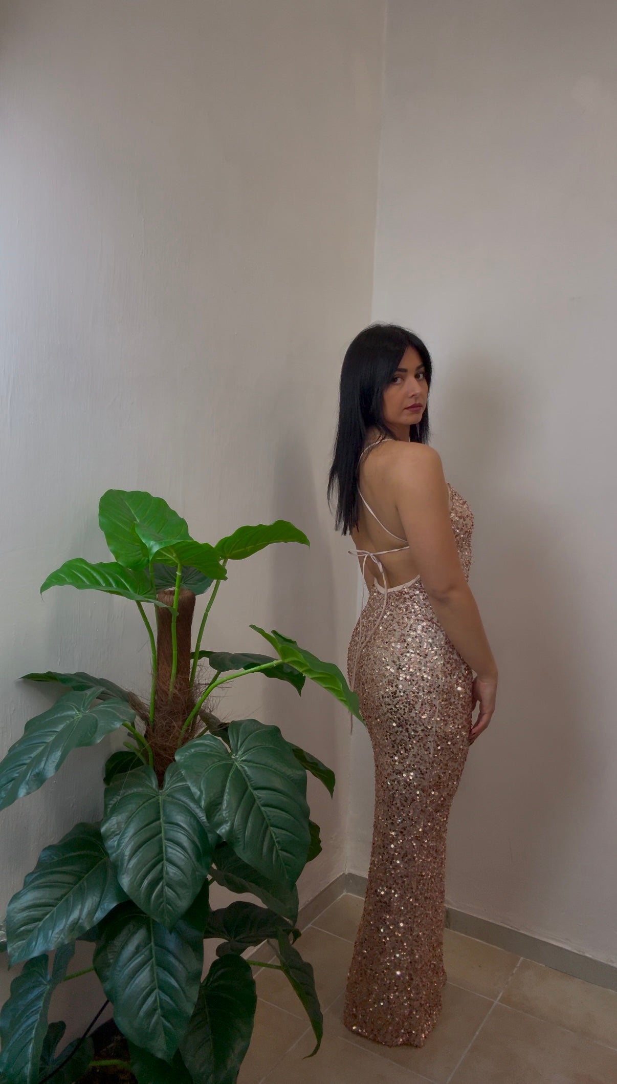 La schiena scoperta aggiunge un tocco sensuale e sofisticato, mentre la lunghezza slanciata dona una silhouette armoniosa.