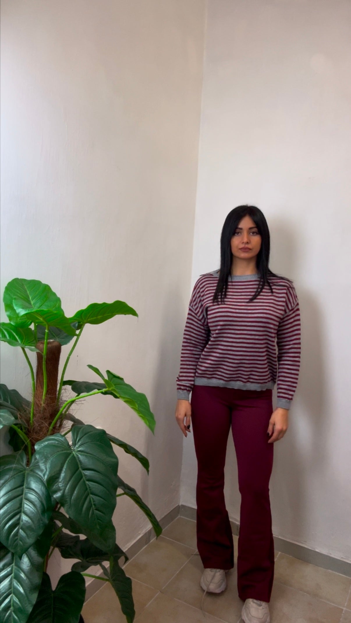 Leggings a zampa bordeaux in tessuto felpato, morbido e confortevole, pensati per valorizzare la figura mantenendo il massimo comfort. La vita è elasticizzata e il modello si apre leggermente al fondo, creando un effetto slanciante. Ideali per look casual, sportivi o da tutti i giorni. Disponibili nelle taglie S, M e L.