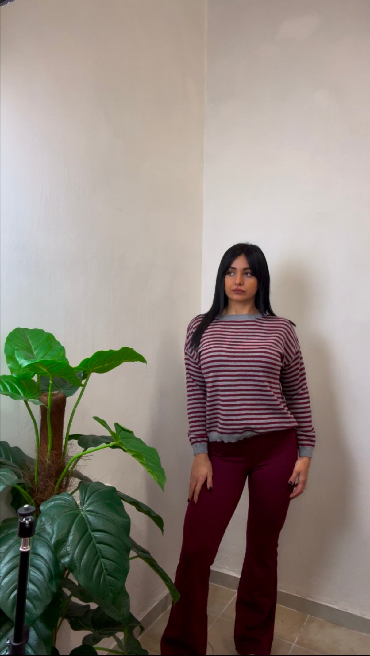 Maglia a righe bordeaux in morbido tessuto leggero, pensata per un look casual e quotidiano. Il taglio regolare e la vestibilità confortevole la rendono facile da abbinare a jeans, leggings o pantaloni a zampa. Ideale per chi desidera un capo pratico ma con un tocco di stile grazie al contrasto delle righe. Taglia unica.