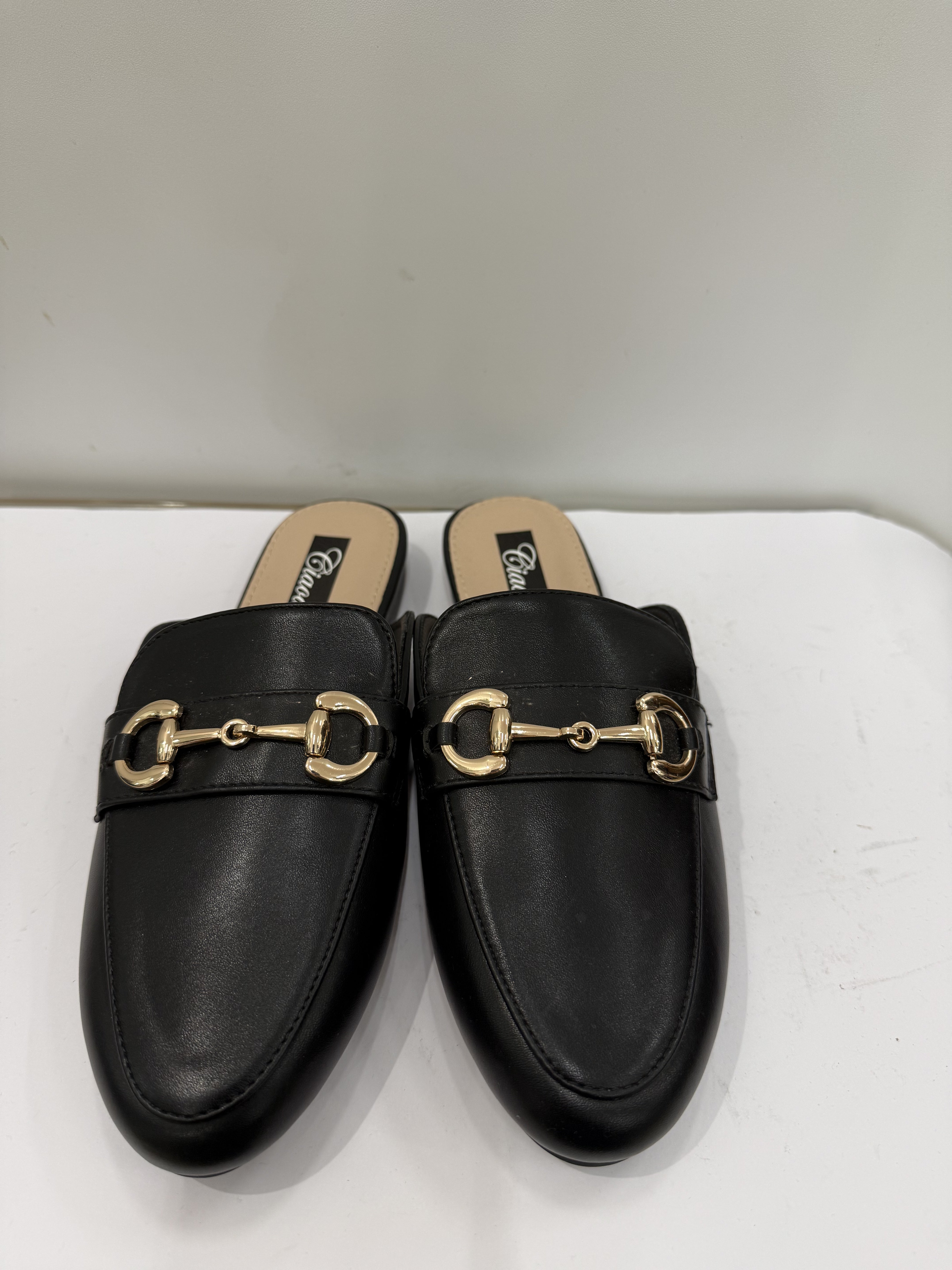 Sabot nero con dettagli dorati in similpelle, un'ode alla raffinatezza. Disponibile nelle taglie 37 e 41, è perfetto per chi cerca un accessorio che unisca eleganza e comfort.
