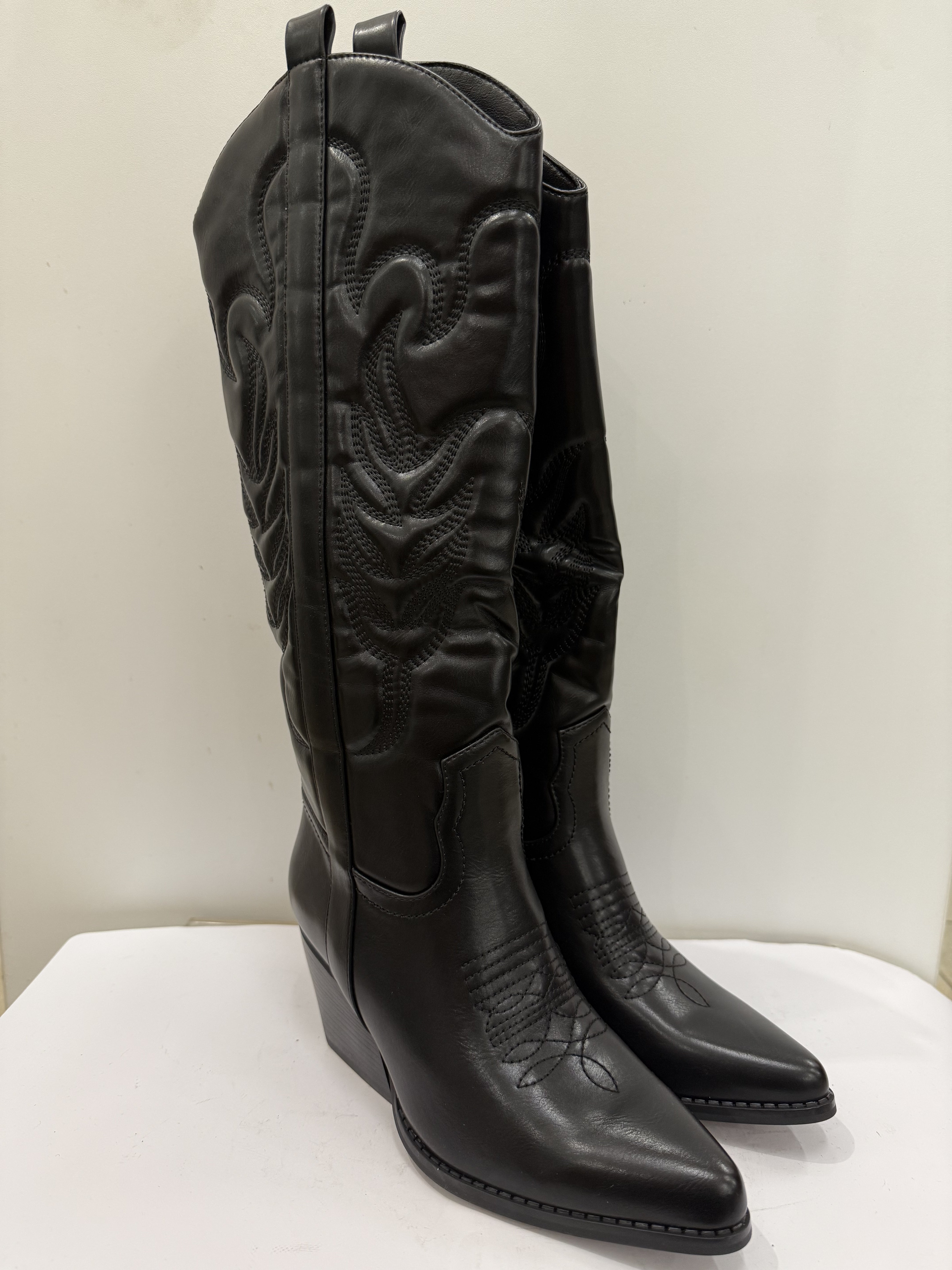 Texano nero in similpelle, disponibile nel numero 36. Un must-have dal gusto western rivisitato in chiave urbana, perfetto per aggiungere grinta a qualsiasi outfit.