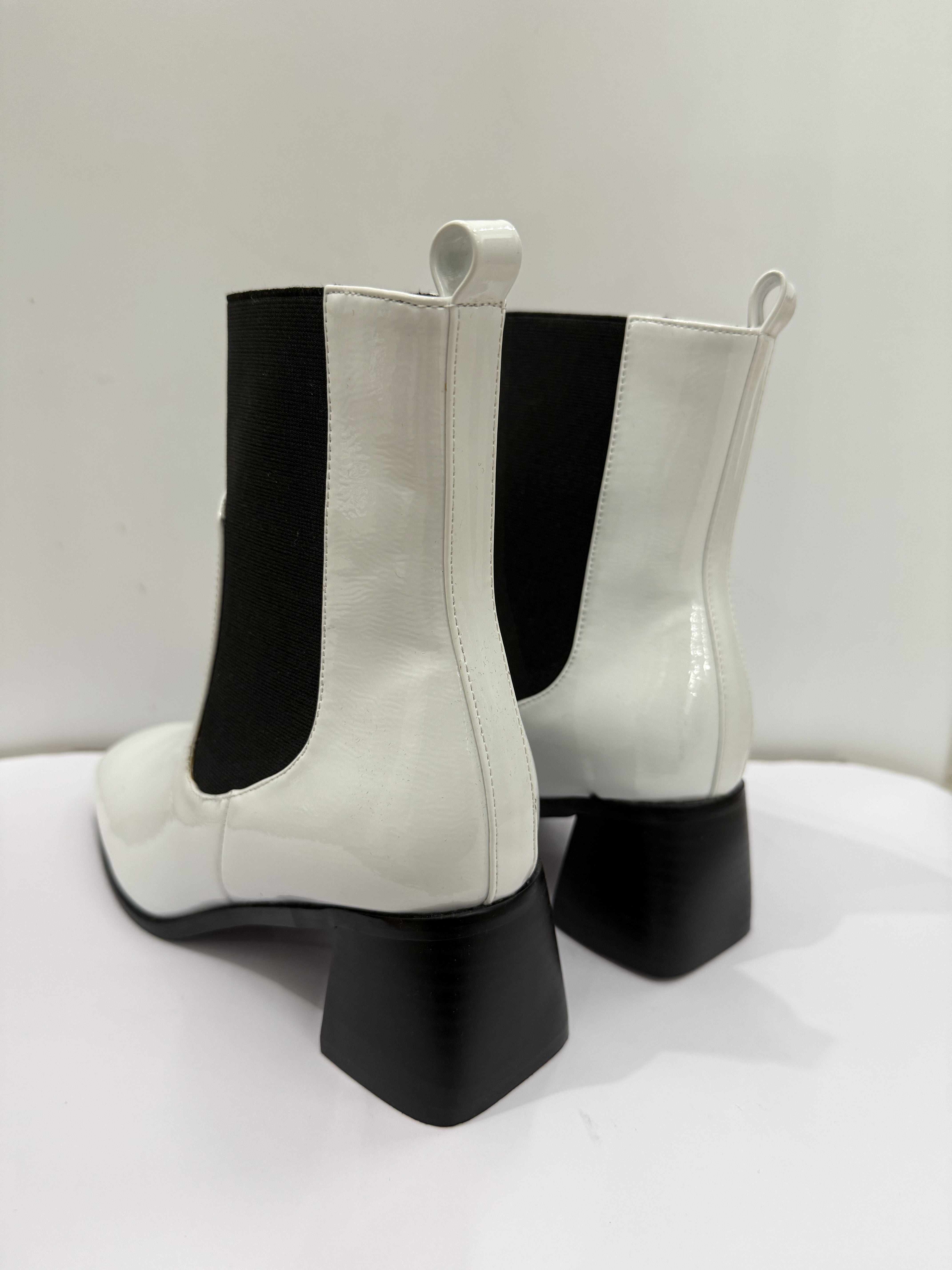 Tronchetto bianco in similpelle, disponibile nei numeri 36 e 38. Un modello moderno e versatile, perfetto per dare carattere a qualsiasi look con un tocco luminoso.