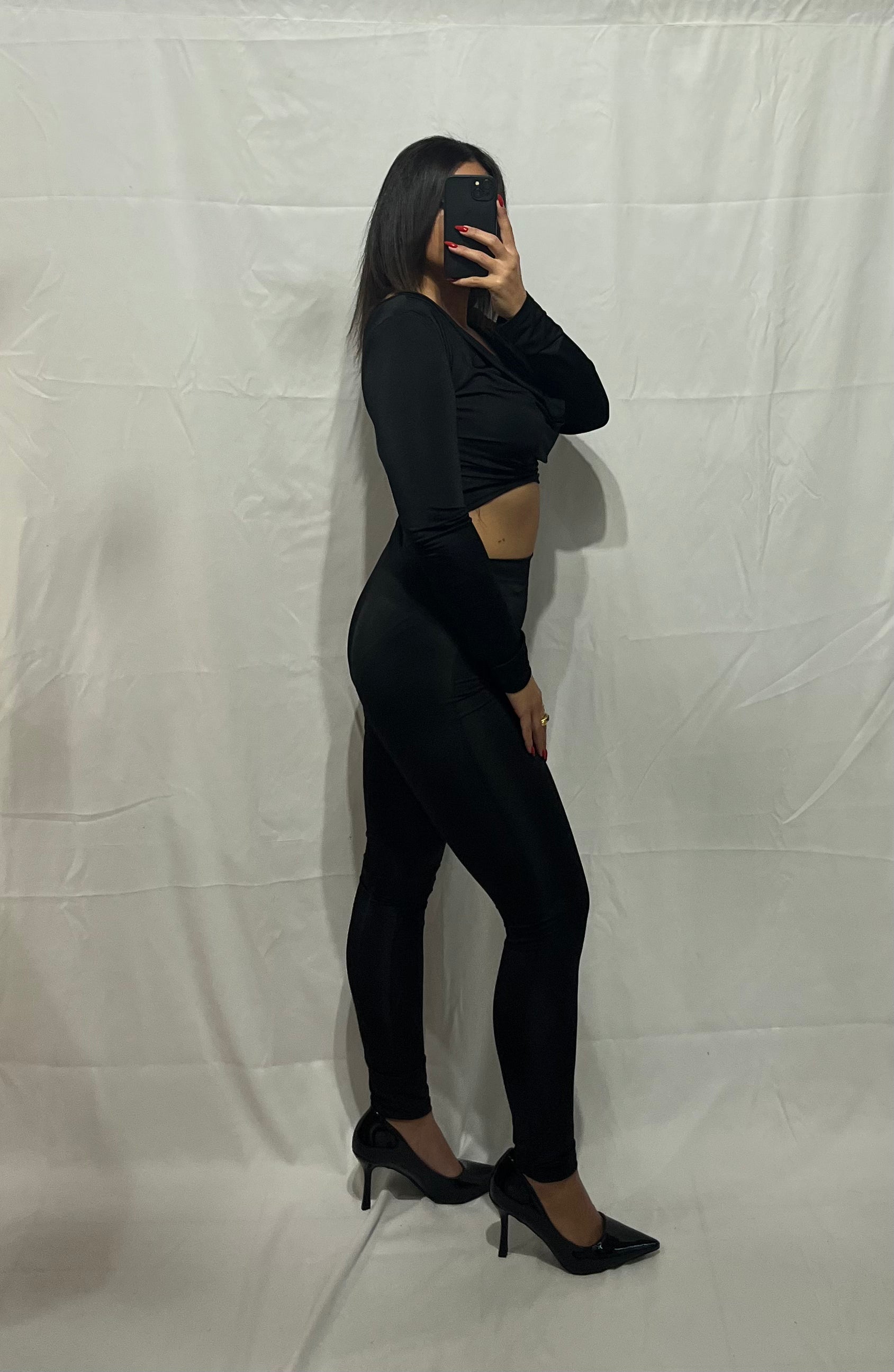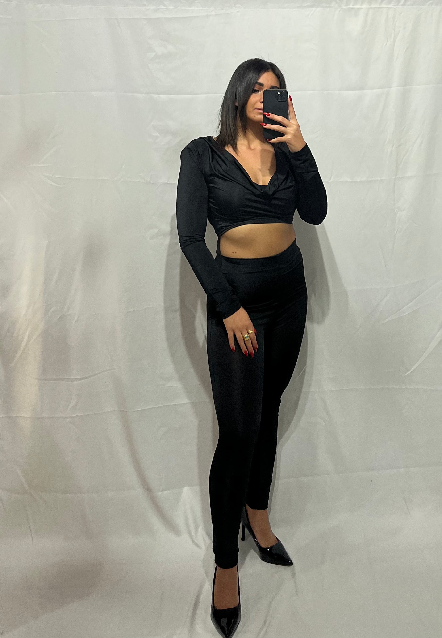 La Tuta Roby nera, in poliestere elasticizzato, è chic e versatile.
